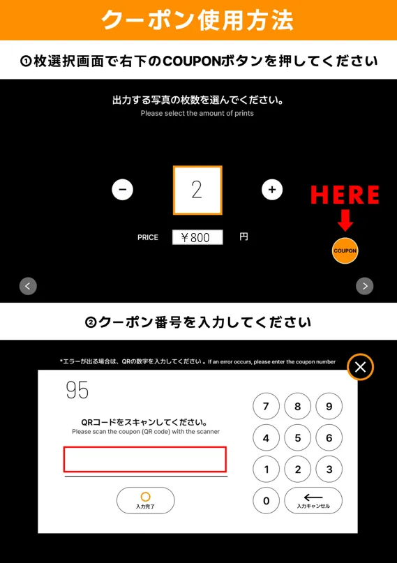 ①枚数選択画面の右下の「Coupon」のボタンをクリックする