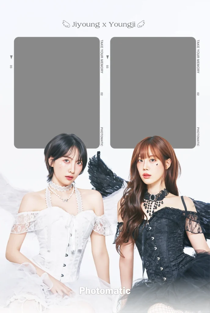 本イベントのメインビジュアルである、「JIYOUNGJI」の天使と悪魔のビジュアルがデザインされたフレームをはじめとした全3種のコラボレーションフレームをご用意。憧れの二人と同じ空間で過ごしたプレミアムな一夜の思い出を、Photomaticのこだわりの照明や撮影空間によって、最高の1枚として記録いただけます。