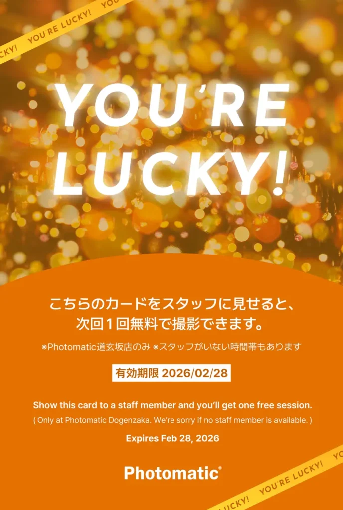 Photomatic 渋谷 道玄坂店のクラシックブースで、対象のカテゴリのフレームで撮影していただいたお客様の中からランダムで次回来店時に使える「無料撮影チケット(ラッキーカード)」が当たります。